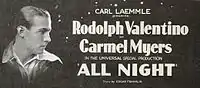 All Night is a 1918 American silent comedy-drama film directed by Paul Powell and starring Carmel Myers and Rudolph Valentino (credited as Rudolpho di Valentina). It was released by Universal Pictures under the name Bluebird Photoplays.[1]