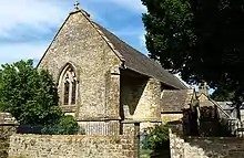 All Saints is built of rubble and ashlar Ham stone.[1] It is made up of a nave, chancel, south vestry, west tower and south porch. The pinnacles and parapet of the west tower have since been removed and the tower shortened to its bottom stage, allowing it to be incorporated under an extension of the nave's roof. The west end of the roof was then provided with a bell-cot and single bell.[2]