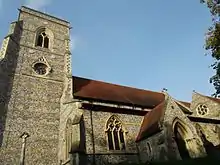 The church has a large four-stage tower at its western end. The tower features a doorway and a four-light window which has, like the other principal windows of the church, flowing tracery. There are three clocks in the third stage of the tower on its north, south and west faces under a gable containing flowing tracery. In the belfry stage the opening on each face is a two-light reticulated window. The tower has diagonal buttresses to its west face, and a NE stair turret which rises above the plain parapets of the top of the tower. The aisles have lean-to roofs and above these, sandwiched in a narrow band below the eaves of the nave, is a clerestory with circular windows with alternating triskele and mouchette-and-quatrefoil infilling. The aisle windows are broad and have flowing tracery in the three lights, alternating in design in each bay. The windows in the Lady Chapel depict Our Lady with the infant Jesus, and were designed by John Lawson of Goddard & Gibbs in 2001.[8] The southern chapel and northern vestry/organ chamber lie under their own gables and have florid three-light fenestration similar to that in the aisles. Both porches have moulded outer doorways. The northern porch is vaulted. An unusual feature of the exterior walls is the widespread traces of former putlog holes, no doubt used for the scaffolding during the construction of the building. These are often found on medieval buildings but were usually carefully filled in and obliterated on Victorian ones. Here they are made a feature of with the side pieces and cappings clearly evident. The hood stops of the arch heads have nearly all been left uncarved.[9]