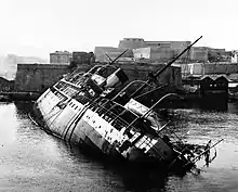 A US Navy salvage party and a detachment of the 1051st Engineer Port Construction and Repair Group arrived on 1 September.[81] The 1051st was a specialized formation that had previously handled the rehabilitation of the ports of Palermo and Naples.[83] The divers of the 1051st discovered that the port and berth entrances had been blocked by 33 ships. Some 65 ships had been scuttled in the harbor channels in a criss-cross arrangement, sometimes in two or three layers. Seven large ocean-going ships had been sunk in a heap at the harbor mouth to block it. The pattern of scuttling and demolition was designed to preclude the laying of piers over sunken ships, as had been done in Naples.[80][81]