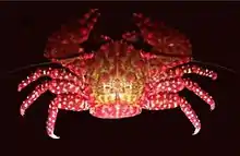 Allopetrolisthes spinifrons grows to a maximum carapace length of around 20 millimetres (0.79 in).[2] It displays an extreme form of carcinisationevolution of a crab-like form – referred to as "hypercarcinisation".[2] In contrast to other porcelain crabs, A. spinifrons shows sexual dimorphism of the pleon (abdomen), closely resembling the situation in true crabs.[2] Females have a large pleon, similar to that of other porcelain crabs, covering almost all of the sternum. Males have a short, triangular pleon that only covers a small part of the sternum.[2] A. spinifrons also differs from its relatives in having many fewer and smaller spines on its legs.[2] These morphological differences are thought to be a consequence of the species' ecology, living in close association with a sea anemone, where the ability to escape by swimming is not needed.[2]