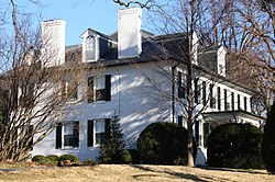 The main house is a two-story five-bay brick house, painted white on a local limestone foundation, with a hipped slate roof. The roof was raised in 1936 and dormers were added. Paired chimneys rise on the east and west sides. The weatherboard 1793 house remains as the rear portion of the main house, but was clad in brick in 1936. The 1936 renovation also added formal entry porches on the south and east sides. Windows are typically six-over-six double-hung sashes with brick flat arches.