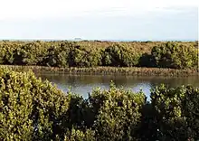 Mangroves on Kororoit Creek, with Port Phillip Bay in the distance.