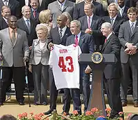 Amani presenting George W. Bush with a personalized Giants jersey on April 30, 2008.[31]