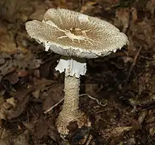 The stem is 8–20 cm (3+1⁄4–7+3⁄4 in) long and 1–2.5 cm (1⁄2–1 in) wide, equal or tapering slightly toward apex, whitish, and floccose to smooth. The basal bulb is club-shaped, ventricose-fusiform or turnip-shaped, rounded or pointed, usually covered with rings of reddish-brown scales or warts of universal veil remains, often extending up the stem for a short distance.[7] The universal veil on the stem base is quite unusual in Amanita, because it forms warts that extend nearly to the very bottom of the bulb.[9] The stem often roots into the soil beneath the bulb with an elongated cord of mycelium known as a pseudorhiza.[10] The partial veil forms a ring that is somewhat membranous, fragile to moderately persistent, and yellowish-white to pale yellow. Eventually, as the mushroom matures, it collapses on the stem as a thin membrane. The flesh is white, with a weak odor of chlorine.[7]