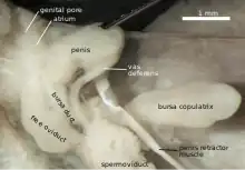 The penis is distinctive by its small size (roughly half the length of the bursa copulatrix and duct) and lack of a penial appendage (although vestigial knobs are occasionally present). However, the penial appendage of A. valentianus may sometimes be inverted inside the penis, so slitting open the penis is necessary to confirm its absence.[1][3]