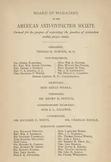 2. 1 2 Santoro, Lily. "History of the American Anti-Vivisection Society". Archived from the original on 2012-04-14. Retrieved 2008-11-25.