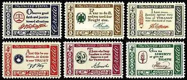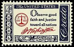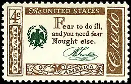 The American Credo postal issues (credo is "I believe..." in Latin) were a series of six commemorative postage stamps issued by the United States Post Office between 1960 and 1961. Issued over a one-year period, the 4-cent stamps feature famous quotes from prominent Americans which are considered to eulogize the principles on which the United States was founded. An opinion poll was taken which consulted one hundred distinguished Americans in public life, which included historians, and presidents of state universities, who collectively chose the given credos found on the stamp issues. The quotes inscribed on the stamps are from George Washington, Benjamin Franklin, Thomas Jefferson, Frances Scott Key, Abraham Lincoln, and Patrick Henry, released in that order. Each stamp bears an inscription of the signature of the man who uttered the credo.[1][2]