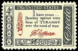 • Thomas Jefferson — First Issued May 8, 1960 at Monticello, the home of Thomas Jefferson. The credo is taken from a letter written by Thomas Jefferson in 1800 to Dr. Benjamin Rush , found in the collected Writings of Thomas Jefferson, volume 10.The stamp also depicts a hand bearing a flaming sword [1][2]\