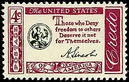 • Abraham Lincoln — First issued November 19, 1960 in New York, NY during the 12th Annual National Postage Stamp Show. The credo is taken from an 1859 letter written by Lincoln to Henry L. Pierce. The stamp also depicts a small image of Lady Freedom [1][2]