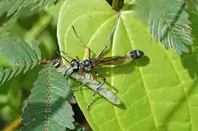 The jaws are not large, but are strong and apart from feeding and digging, often are used for unexpected functions such as holding a pebble with which the wasp hammers down soil to seal a nest,[2] or to grip the stem of a plant at night, holding its body at right-angles to the stem, its legs folded and all the weight taken up by the mandibles. This habit is not unique to the Ammophilinae some bees, such as Amegilla, also overnight in that way, and Fabre documented some others.[3]