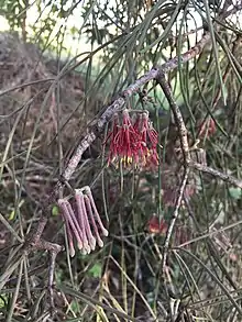 Amyema cambagei, commonly known as sheoak mistletoe, is a species of flowering plant, an epiphytic hemiparasitic plant of the family Loranthaceae endemic to Australia, and found in New South Wales and Queensland in sclerophyll forest and woodland on several species of Casuarinaceae.[3]