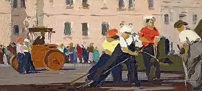 Anatoli Nenartovich is the author of the paintings and cityscape etudes Winter Ship camp on the Neva River,[4] In Winter at the Bridge of Lieutenant Schmidt (both of 1949), Asphalting of a street″ (1956), Construction of Hydro-Electric Power station″, ″A Central heating line laying″ (both 1957), ″Leningrad builders″, ″A Leningrad street″, Laying of the Heating pipe-line[5] (both 1958), ″Women on Asphalting works″, ″Asphalt laying works on Leningrad street″, ″A Gas-pipe laying″, ″Asphalting workers″, ″Asphalting of the street″ (all 1959), Plant[6] (1960), Asphalt-laying ladies[7][8] (1961), Birches, Sunny[9] (1963), Asphalt Pavers (1961), Asphalt Pavers, New District, Yachts, On the Outskirts (all 1964),[10] Lev Tolstoy Square[11] (1973), Still Life on Red Material (1979),[12] Still Life with a Tea Cup[13] (1980), Still Life with a Watermelon (1981), and others.