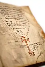The Anbandidi Gospel (Georgian: ანბანდიდი სახარება, romanized: anbandidi sakhareba) consists of four Gospels and dates back to the 9th century. They are currently housed in the National Archives of Georgia, fond #1446, manuscript #107. They have 192 pages, are made of parchment. The dimensions are: 317x237; Asomtavruli; ink – brown, embellished initials – in certain cases with cinnabar. The text is rewritten in some parts; the manuscript is entirely written in Asomtavruli, in two columns; upper borders are cut and the traces of upper quire pagination are lost; ruling lines and dots are very visible.