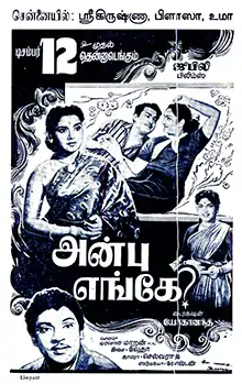 Anbu Engey (transl.Where is love?) is a 1958 Indian Tamil-language drama film, directed by D. Yoganand and produced by V. Govindarajan. Its story and dialogue were written by Murasoli Maran, and screenplay by Rajendra. The film stars S. S. Rajendran, K. Balaji, Pandari Bai and S. V. Ranga Rao, with Devika, T. R. Ramachandran, Manorama and Mynavathi in supporting roles.[1] It was released on 12 December 1958.[2]
