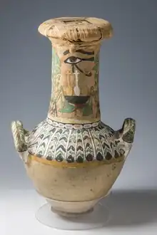 Ancient Egyptian pottery includes all objects of fired clay from ancient Egypt.[1] First and foremost, ceramics served as household wares for the storage, preparation, transport, and consumption of food, drink, and raw materials. Such items include beer and wine mugs and water jugs, but also bread moulds, fire pits, lamps, and stands for holding round vessels, which were all commonly used in the Egyptian household. Other types of pottery served ritual purposes. Ceramics are often found as grave goods.