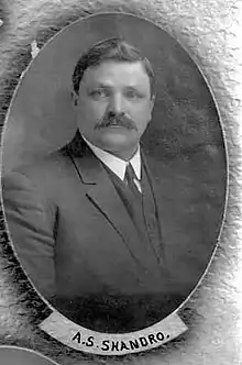 Andrew Stefan Shandro was born April 3, 1886, in Ruskiy-Banyliw Bukowina to Stefan Shandro and his wife, Anastasia (née Ostashek).[1] He was a member of the Ukrainian Orthodox Church of Canada. His grandfather was a judge and an uncle was a general in the Austro-Hungarian army. He emigrated to Canada in 1899 with his parents from the Austro-Hungarian Empire and settled northeast of Andrew, Alberta[2] near the North Saskatchewan River. He became a prominent farmer and was postmaster of Shandro, Alberta, a rural community that bore his family's name.[3] In 1905 he married Rose Hawrelak, daughter of Nicoli Hawrelak of Bukowina; they had six children. Shandro was educated at Edmonton Business College and became a Dominion Lands Act federal homestead inspector in 1907. In the summer of 1916, he married Olga Kraft in Winnipeg. Olga was the youngest daughter of Leontania Kraft and her husband William (deceased), who had immigrated to Manitoba from what would become Poland after 1918. Andrew and Olga had one daughter named Wanda, making Andrew’s total number of children seven. Andrew and Olga’s long divorce, was completed in 1937.