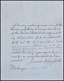 President James Garfield’s order to Secretary of State to approve the treaty