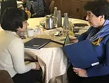 Angellica Aribam negotiating a deal with Prime Minister Beatriz Merino in a simulation exercise.