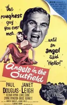 Angels in the Outfield is a 1951 American comedy film produced and directed by Clarence Brown and starring Paul Douglas and Janet Leigh. Based on a story by Richard Conlin, the film is about a young woman reporter who blames the Pittsburgh Pirates' losing streak on their abusive manager, who begins hearing the voice of an angel promising to help the team if he changes his ways. The film was released by Metro-Goldwyn-Mayer on September 7, 1951.[2] It was U.S. President Dwight D. Eisenhower's favorite movie.[3]