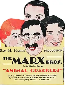 Animal Crackers is a musical play with music and lyrics by Bert Kalmar and Harry Ruby and a book by George S. Kaufman and Morrie Ryskind. The musical starred the Marx Brothers and is set at the Long Island Home of Mrs. Rittenhouse; a character portrayed by Margaret Dumont in the 1928 production on Broadway.