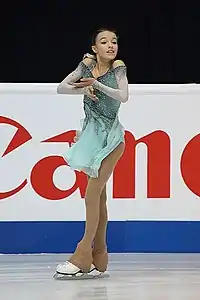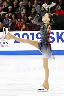 • Set the new record for the highest valued single jump when she earned 14.79 points for her quadruple Lutz at the 2019 Skate America. At this competition, she also set the new record for the highest valued jump combination when she earned 18.66 points for her 4Lz+3T combination.[36] This was later broken by Alexandra Trusova when she earned 14.95 points for her quadruple Lutz at the 2019 Rostelecom Cup.[127]