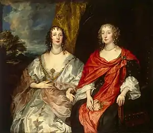 She is known to have been painted twice by Anthony van Dyck, once standing by herself[1] and once seated with a fellow lady-in-waiting, variously suggested to be Anne Dalkeith[4] or Charlotte, Lady Strange, Later Countess of Derby.[5][6]