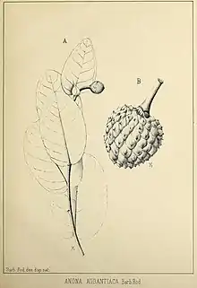 Drawing detailing the morphology of Annona aurantiaca including leaf attachment and berry fruit