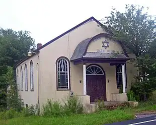 The former synagogue is a single-story three-by-four-bay building on a concrete foundation with stucco siding and a gabled roof shingled in asphalt. A four-bay addition projects from the rear. The west (front) facade features a porch with bell-shaped roof supported by two round wooden columns rising from a concrete stoop. The porch's entablature features the name of the synagogue and a Star of David. Both sides and the original rear wall feature large round-arched windows with colored and opaque glass.[1]