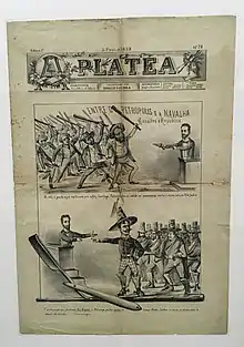 In 1887 another son was born, on 14 July; as this was Bastille Day the boy was named Danton Condorcet.[2] By this time he had thrown himself completely into the campaign for a republic, to the extent of giving up his place at the bar and dissolving his partnership with Martim Francisco Ribeiro de Andrada III. On January 28, 1888 he held the first republican rally in the country. From then until the end of 1889, he dedicated himself to the republican campaign, traveling between Rio de Janeiro, São Paulo and Minas Gerais.[1] His outspokenness earned him many enemies and on one occasion his life was threatened by the ultramonarchist Guarda Negra.[2]