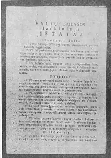 Besides his duties as commander, Bakšys also actively printed newspapers like Laisvės Varpas. He searched for alternative methods of resistance as he realized armed resistance of the partisans was becoming weaker and that the movement must incorporate intellectual means.[8] Bakšys consequently established the Vyčiai Union (Vyčių Sąjunga) in 1952. A newspaper entitled Vyčių Keliu was established as well.[10] The union was meant to retain the traditions of the LLKS and to unite legally living resistance members as well as partisans. Each group of active partisans was given the order to establish local unions, however, it was relatively difficult as there was intense anti-partisan activity and the resistance itself was much weaker than before, and consequently, the union could not establish significant influence. The Union's 1952 program, based on Lithuania's 1922 constitution, stated that "the further goal of the struggle is the defense of the nation's right to decide its own future destiny by choosing a new order and structure of the government apparatus and ensuring the conditions for rapid democratic cultural progress".[3][6] The union's statute also marks Lithuania's right to the regions of Vilnius, Klaipėda and part of Prussia. It also contained future industrial, agricultural, and educational reforms. The largest farms were supposed to be 30ha, and other lands would be confiscated in an attempt to fund small landowners and landless people. Education until 8th grade would be necessary, and importance would be placed on national culture and Christian values.[11] The union was dissolved after Bakšys's death.[2]