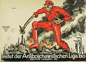 In February 1919, leading members of the League such as Stadtler, Ernst Troeltsch, Gleichen and Joachim Tiburtius published a call for the establishment of a League for the Protection of German Culture in the Catholic daily Germania. The Anti-Bolshevik League appeared under this name from then on. The organization's leadership felt the renaming was necessary after major league events in Essen and Hamburg were blasted by workers. This seemed to indicate that the original name was "burnt". Gleichen had also advised the renaming in order to make it clear "that our 'anti-Bolshevism' is under no circumstances only negative or even contains a tip against the workers."[4] Stadtler explained that they wanted to break away from the competing association to combating Bolshevism, which published hate posters with bounty awards on Karl Radek and other leading members of the Spartacus League.[14] After Stadtler's withdrawal, the league largely gave up the "National Socialist" thrust of its publications and events. Now she took a more moderate course and from then on devoted herself to "enlightenment" about the "dangers" of communism. In this phase it was financed, among other things, by the Reich Citizens Council. However, big industry and banks remain influential. By the summer of 1919 the League had published eight different series of pamphlets containing some 70 individual titles and a large number of leaflets. The pamphlets bore titles such as In the "Bolshevik Madhouse", "The Imperialism of the Bolsheviks", "The Despots of the Soviet Republic and Asian Bolshevism - the end of Germany and Europe?".[15] The league continued the agitation of this type in the following years. According to documents from the Reich Commissioner for the Surveillance of Public Order, by the end of 1922 she had organized exhibitions in 80 German cities that were visited by around 800,000 people, as well as around 8,600 lectures and around 400 training courses lasting several weeks, usually with 120 to 150 participants.[16]