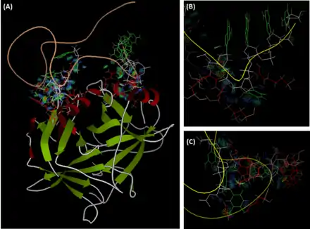The nucleotides G23, T24, G25, A26, C27 in the duplex and T9, T18, T19, G20 in G-quadruplex contribute to the interaction with the exosite II of thrombin. On the protein side, the residues Tyr89, His91, Pro92, Arg93, Tyr94, Asn95, Trp96, Arg97, Arg126, Leu130, Arg165, Lys169, His230, Arg233, Trp237, Val241 and Phe245 in thrombin are involved in the interaction. Since the exosite II is a positively charged motif, it creates many ion pairs with the HD22 backbone especially in the duplex region. Hydrophobic interactions are mainly observed in the G-quadruplex region (T9, T18 and T10), and this stabilizes the complex formation. Moreover, Interacting with thrombin improves the thermal stability of HD22 structure, and results in the increase of melting temperature (from 36 to 48 °C).[19] Calculated binding energy of HD22 to thrombin exosite II is -88.37 -kcal.mol-1.[14]