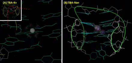 In addition to protein-selectivity, TBA also shows ion preference. A potassium ion helps TBA fold into a G-quadruplex structure, which results in a significant positive band at 295 nm and a negative band at 270 nm on its circular dichroism (CD) spectrum. Also, potassium ion improves the thermal stability of TBA.[8] The melting temperature of TBA's G-quadruplex (measuring the intensity change of the peak at 295 nm by CD) in the presence of sodium ion and potassium are 24 °C and 53 °C, respectively.[7] Compared with sodium, potassium ion fits perfectly to the cavity between two G-tetrad plane and is coordinately bound to four O6 atoms in each plane. This enhances the structural stability of TBA. In contrast, due to its small size, sodium ion can only interacts with four rather than eight oxygen atoms of two G-tetrad planes, and accordingly has two alternative position in the cavity. Thrombin shows similar influence as potassium ion. In the ion-deficient condition, thrombin helps TBA form into a stable G-quadruplex structure from a randomized coil, which results in conformational change.[8] Some groups use this property to develop aptamer-based thrombin sensors. For this purpose, TBA is usually mounted with an additional sequence with a FRET (Förster resonance energy transfer) pair to form a transient duplex structure. Once the TBA part interacts with thrombin, the conformational change would change the distance between the FRET pair and lead to a fluorescent output. This approach provides nano-molar sensitivity and is capable of sensing thrombin in the spiked serum.[9]