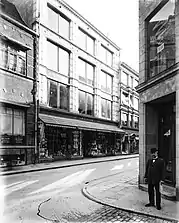Illum's first building at Østergade 52, possibly with Illum seen at the corner to the right, photographed by Peter Elfelt