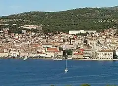 Šibenik cityscape from the north (St. John's fotress). White gymnasium building can be seen on the far left. St. Michael's fortress in centre