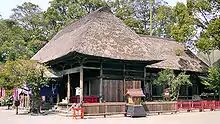 Until the early modern period, Shinto and Buddhism were practiced based on the Shinto aspects of both parts, with the god Takeiwatatsu-no-Mikoto enshrining the Eleven-Headed Kannon, the god Asutsuhime-no-Mikoto enshrining Fudo Myo-o, and the god Kunizo Hayamikatama enshrining Bishamonten as the main Buddha.[1] However, in 1665, the shrine was converted to be a completely Shinto shrine.[2]
