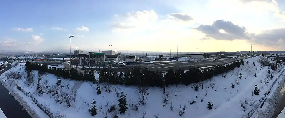 The Aomori-chūō Interchange, south of Central Aomori, is a continuous green-T hybrid interchange. The interchange is 6.1 kilometres (3.8 mi) from Aomori IC and 9.5 kilometres (5.9 mi) from Aomori-higashi IC, the respective western and eastern termini of the expressway.[2] It is a junction of the Aomori Expressway and the Aomori Belt Highway (National Route 7), which serves as an access road along much of the expressway.