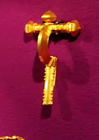 The discovery of the first tomb in 1889 was made while taking gravel from a neighboring area of Apahida.[5] Some of the artifacts were recovered for the Transylvanian Museum by H. Finály and another two pieces (a sealing ring with monogram and a pendant with bells) were purchased by the Hungarian National Museum on the antiquities market in 1897. From the inventory of the tomb were preserved many objects of gold, a cruciform brooch with onion-shaped cufflinks, a bracelet with thickened ends, three rings, a belt buckle and a second smaller buckle, five pendants with bells, two silver mugs, a gold band, and several appliques, probably used to decorate or repair vessels.