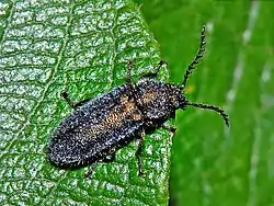 Aplocnemus alpestris can reach a body length of about 5–6 mm (0.20–0.24 in).[2] These soft-winged flower beetles have an elongated, cylindrical body. Pronotum and elytra have a slightly shiny black color. They are coarsely punctuated, with a long grayish pubescence. The antennae show a sexual dimorphism in their structure, as in males they are deeply serrated, while they are shallowly serrated in females.[2][3]