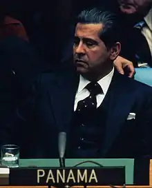 Aquilino Boyd was one of the first wave of civilian politicians to make peace with the military dictatorship (1968–1989). In his capacity as a diplomat and foreign minister played a key role in the negotiations that led to the 1977 Panama Canal Treaties.[5] He served as foreign minister of Panama (1976–77), permanent representative to the United Nations (1985–89, 1997–99), ambassador to the United States (1982–85) and to the United Kingdom (1994–97). [6] In 1979 he became one of leaders of the Liberal Party. He was the COLINA nominee for second vice-president of Panama in 1989. [7]