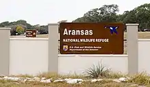 Aransas National Wildlife Refuge is a 115,324-acre (466.7 km2)[1] protected area situated on the southwest side of San Antonio Bay along the Gulf Coast of the U.S. state of Texas. It is located in parts of Aransas, Refugio, and Calhoun Counties. It is situated on the southwest side of the San Antonio Bay, formed by the mouth of the Guadalupe River. It also includes nearly the entirety of Matagorda Island, a 38-mile barrier island.[2] The Aransas National Wildlife Refuge was established by Executive Order 7784 on 31 December 1937 by President Franklin D. Roosevelt as the Aransas Migratory Waterfowl Refuge as a refuge and breeding ground for migratory birds and other wildlife. Roosevelt issued a proclamation in 1940 changing the name to the Aransas National Wildlife Refuge.[3]