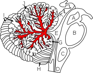 Figure shows cerebellum and surrounding regions; sagittal view of one hemisphere. A: Midbrain. B: Pons. C: Medulla. D: Spinal cord. E: Fourth ventricle. F: Arbor vitae. G: Flocculus. H: Tonsil. I: Posterior lobe. J: Anterior lobe. K: Inferior colliculus. L: Superior colliculus.