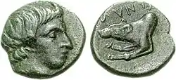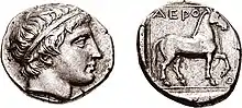 Triobol of Argos (top), and a bronze coin of King Amyntas II of Macedon (bottom). The early Argead kings often copied the wolf of Argos' coins on their own coinage to highlight their supposed ancestry from this city.[10]