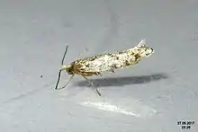 The wingspan is 8–9 mm. Adults are on wing from June to July depending on the location.