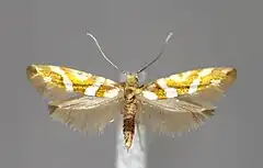 Argyresthia goedartella has a wingspan of 10–13 mm.[6][7] These tiny moths have pale ochreous head with white antennae and white forewings with coppery-golden markings. A characteristic coppery-golden Y-shaped marking is present in the middle of the wings.[6] Hindwings are dark gray. Abdomen is grayish fuscous, while legs are brownish white.[7]