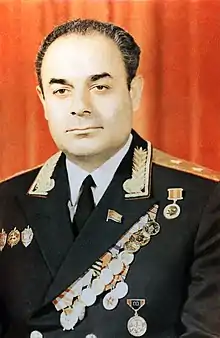 Arif Nazar oglu Heydarov (Azeri: Arif Nəzər oğlu Heydərov, June 28, 1926, Agdash—June 29, 1978, Baku) was a Soviet Azerbaijani state figure and a General-Lieutenant of the Soviet Azerbaijani Ministry of Internal Affairs. He headed this ministry from March 19, 1970, until his death. Previously he used to work in security agencies. Heydarov was shot by Shusha prison officer Zia Muradov in his office, along with Deputy Minister of Internal Affairs Salahaddin Kazimov. Muradov then shot himself. [1]