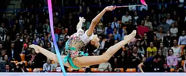 Arina Alekseyevna Averina (Russian: Арина Алексеевна Аверина; born 13 August 1998)[6] is a Russian individual rhythmic gymnast. She is a 2020 Summer Olympics finalist, a two-time (2017, 2019) world all-around silver medalist, a two-time European all-around champion (2018, 2021) and the 2016 Grand Prix Final all-around bronze medalist. She is a three-time (2019-2021) Russian national all-around champion and a three-time (2015, 2017, 2022) Russian national all-around medalist. Her identical twin sister Dina Averina is also a competitive rhythmic gymnast.