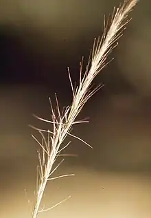 This perennial bunchgrass produces stems up to 100 centimeters tall. It lacks rhizomes. The leaf blades are hairless, pale green, and up to 25 centimeters in length. They may become curly with age.[2] The panicle-shaped inflorescence has branches appressed to the stem, making it narrow. The awns may be up to 2.5 centimeters in length.[1]