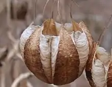 The globular shaped fruits bore on October, has 6 holes containing many seeds. The lower part of the fruits divide, each of them hanging on to the peduncles, splitting like tiny strands, and shape like parachutes.